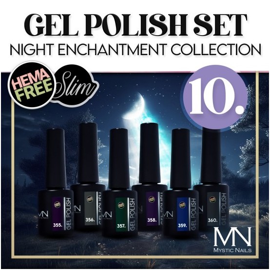 Když padne noc, světla ztlumí a všechny barvy se stanou hlubšími. Sada gelových laků Night Enchantment (355-360) zachycuje tento okamžik – šest okouzlujících odstínů, které společně odhalují nejkrásnější stránku temnoty.